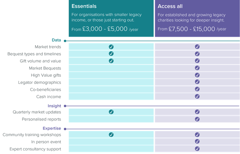 To ensure we can best support charities of all sizes wherever they are in their legacy income journey, we have devised two versions of Legacy Navigator. The full Legacy Navigator created for charities with established legacy programmes looking to maximise their performance and inform their strategy. And an Essentials version designed for charities who are wanting to develop and strengthen their legacy strategy. See the table below to find out which Legacy Navigator is best suited to help your charity.