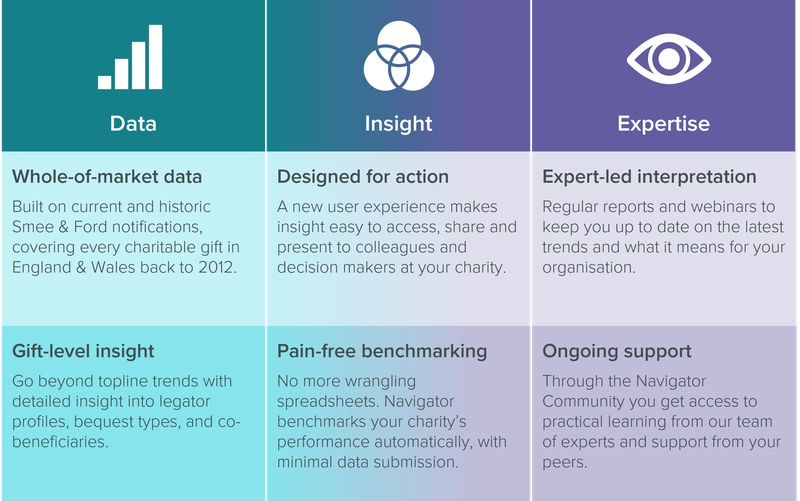 Legacy Navigator has been created in partnership with charities to bring something new to the sector; a product that seamlessly combines exclusive market-wide data, expert analysis, and peer learning on one platform.